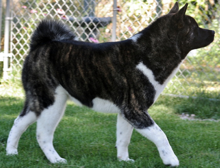 Charley is from our very nice breeding of Apollo and Journey. As we anticipated, she has slowly and steadily matured into a beautiful young lady. A striking black brindle and white with just the right combination of good traits from each parent, we’re very excited about her future contributions to our breeding program. As well as inheriting so many good traits from her parents, she also inherited their lovely temperaments. As trite as it might sound, the word “good” describes her to a tea. She was a good puppy who has grown in to a good adult. She’s good at kisses, she’s good at traveling, she’s good at watching TV, she’s good at going for walks, hanging out on the porch, sleeping upside down, being bathed, playing Akita fetch, and hopefully, very soon, she will be good at being a show dog.
